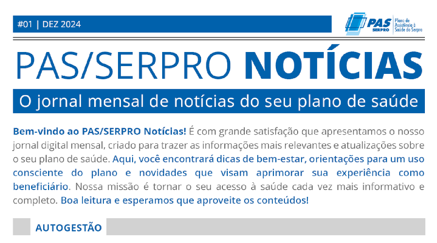 13/01/2025 - O PAS-Serpro lançou no mês passado a primeira edição do jornal digital "PAS/SERPRO NOTÍCIAS", com o slogan "O jornal mensal de notícias do seu plano de saúde". Trazemos neste Boletim o link para você ter acesso ao jornal. Leia a matériaBem-estar