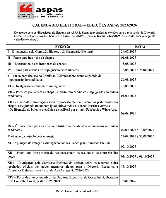 A assembleia geral dos associados da ASPAS, realizada no último dia 24 de julho, elegeu a Comissão Eleitoral e definiu o calendário das eleições deste ano na Associação. Entre os dias 22 e 30 de setembro, os associados votarão pela internet, no site da ASPAS, elegendo diretoria e conselhos para a Gestão 2026/2029.