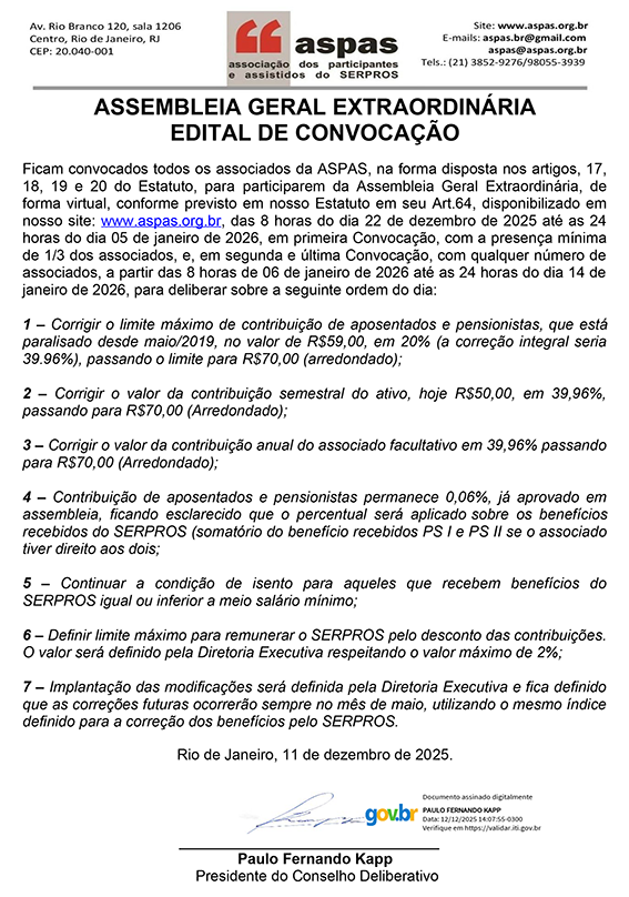 Nossa Associação realiza Assembleia Geral Extraordinária, no formato online, a partir das 8 horas desta 2ª feira, dia 22 de dezembro. Na pauta, os itens recentemente aprovados pelo Conselho Deliberativo da ASPAS, mas que agora vão para a decisão de todos os associados.