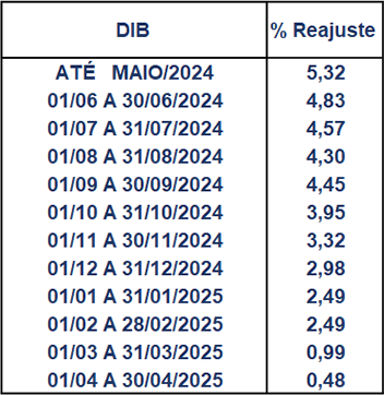 Todos os benefícios com DIB até 31/05/2024 terão reajuste de 5,32%, enquanto os benefícios com DIB posteriores a 31/05/2024 terão reajuste proporcional, conforme a tabela ao lado.
