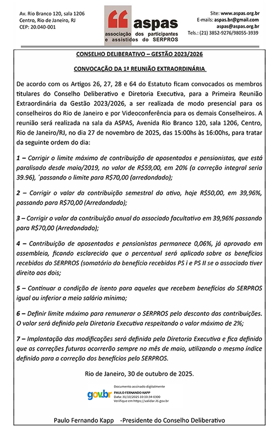 Conselho Deliberativo da ASPAS convoca reunião extraordinária para 27/11