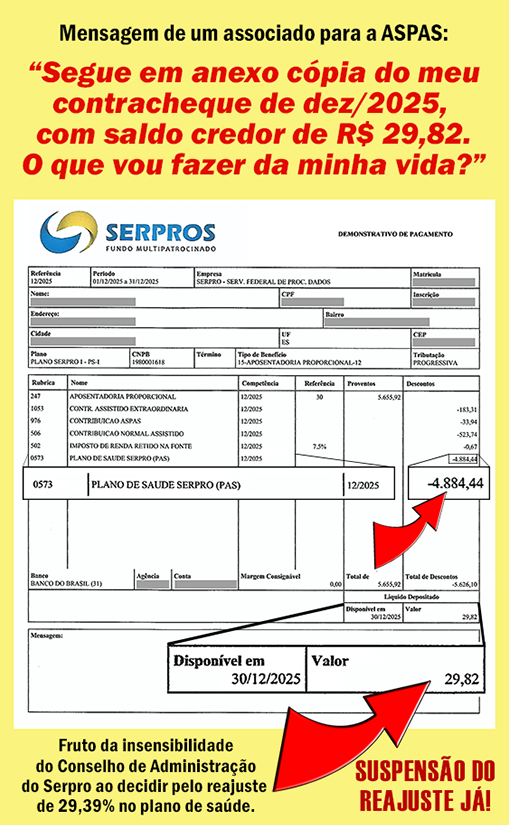 Aposentados de todo o Brasil já enviaram mensagens para a ASPAS reclamando do alto custo do plano de saúde e do enorme impacto deste último reajuste em seus orçamentos pessoais. O contracheque publicado acima, de um associado da ASPAS no Espírito Santo, é uma demonstração cabal do que esse reajuste está significando na vida de quem dedicou décadas de sua existência para o progresso do Serpro.