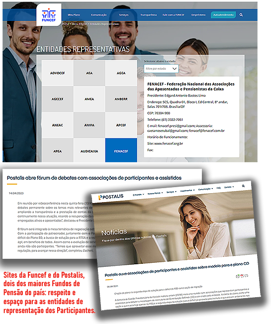 Uma rápida pesquisa nos sites dos principais fundos de pensão do Brasil revela que alguns deles mantêm uma sólida parceria institucional com as entidades que representam os participantes e assistidos. Enquanto a Funcef – fundo dos funcionários da Caixa – divulga democraticamente as informações e o site de todas as associações e entidades dos participantes, o Postalis, outro gigante do setor, pertencente aos funcionários dos Correios, promove e divulga os debates e propostas das associações de participantes e assistidos em sua página na internet.