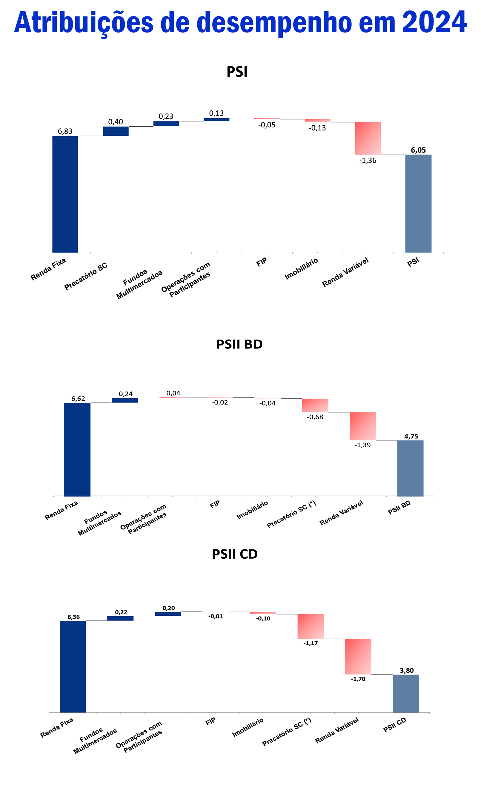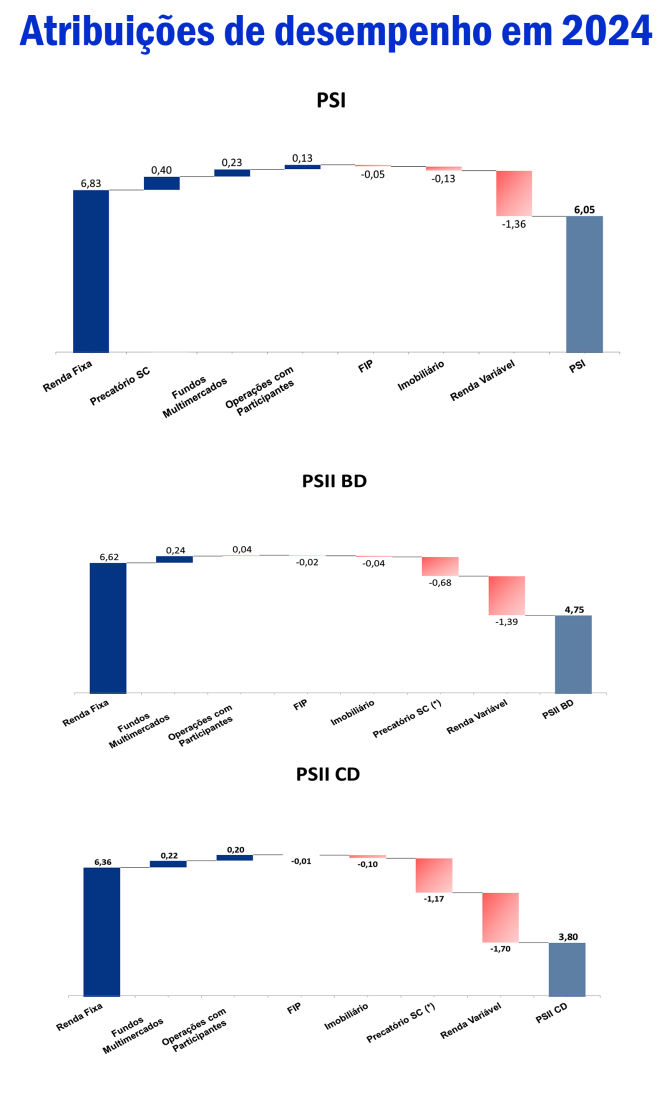 (O PS-I) "Encontra-se deficitário, com aumento da insuficiência de R$ 88,14 milhões em relação ao ano anterior, devido a rentabilidade do plano ter sido inferior à meta atuarial em R$ 127,44 milhões, compensada com os ganhos atuariais de R$ 37,12 milhões, decorrentes de postergação de aposentadoria de participantes elegíveis (+R$ 51,81 milhões), sobrevivência acima da esperada (-R$ 33,24 milhões) e alterações cadastrais (+R$ 18,55 milhões). Além disso, valores destinados às reversões de contingências e outras deduções de R$ 2,18 milhões reduziram parcialmente o impacto".